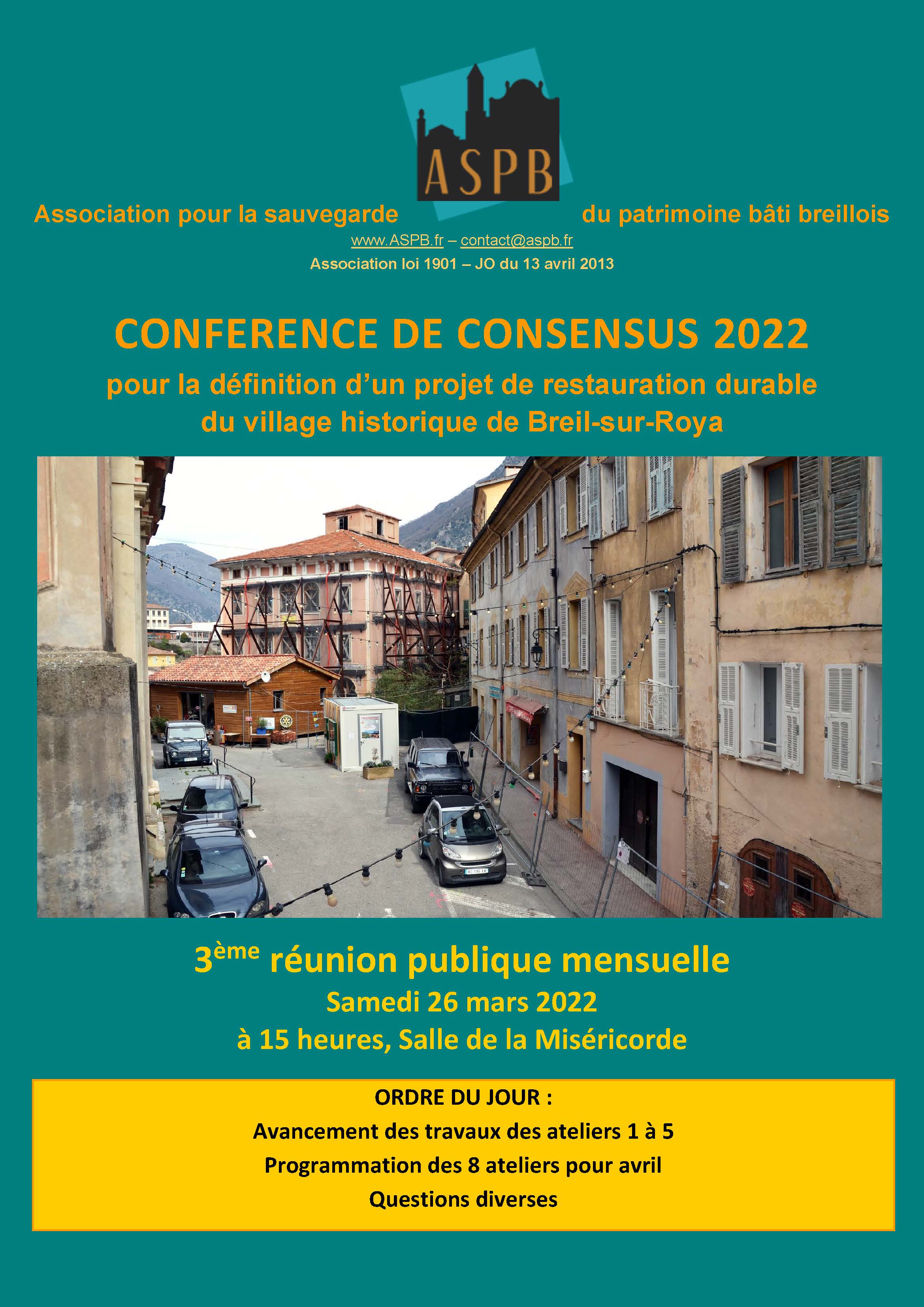 L’association pour la sauvegarde du patrimoine bâti breillois, en concertation avec le maire de la commune, vous invite à la troisième réunion publique mensuelle, organisée dans le cadre de la Conférence de consensus pour la définition d’un projet de restauration durable du village historique de Breil-sur-Roya.